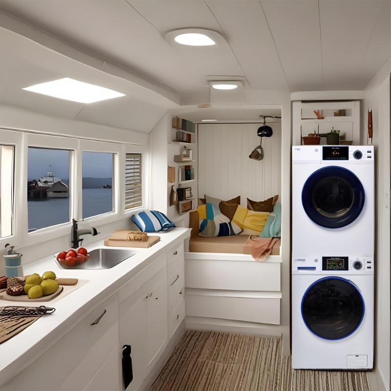 Measuring 67 x 23.5 x 22.2 inches (HxWxD), this set can be stacked to conserve vertical space or installed side by side, depending on your vessel’s configuration. Despite its small footprint, it offers generous capacities: 1.62 cu. ft. for the washer and 3.1 cu. ft. for the dryer, each capable of handling up to 15 lbs of laundry per cycle.